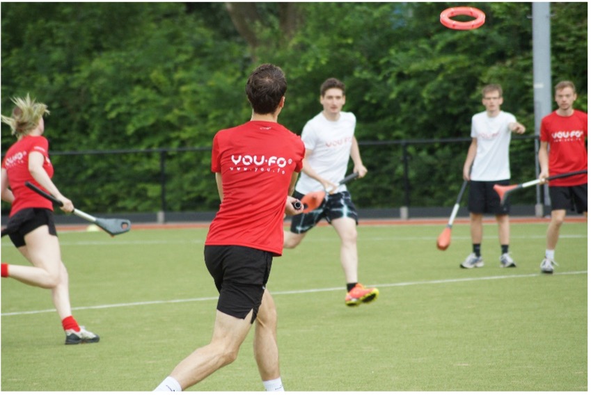 The official sports game is called YOU.FO Zone and can be played 3 against 3, 4 against 4, or 5 against 5. It is an invasion game, in which teams score by catching the aerodynamic ring in the opponent’s scoring zone. The uniqueness of the concept, based on research, can be found within the rules: self-regulated (played without referee), non-contact and mixed-gender (inclusiveness) and you continue playing at all times (there is no out-of-bounds). If the ring isn’t caught, each player could ‘claim it’, being the first one to tap their stick in the ring. Making it a fast-paced sports game, that only stops after a score. In addition, it is not allowed to walk or run while in possession of the ring. Insuring interplay dynamics and teamwork.