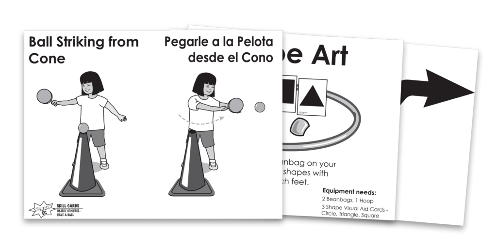 Cards may be used as teaching aids, for stations in a circuit, or in combination to create movement routines. English/Spanish